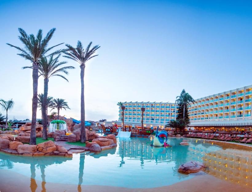 Es un hotel con toboganes en frente de la playa que está enfocado al entretenimiento de los niños.
